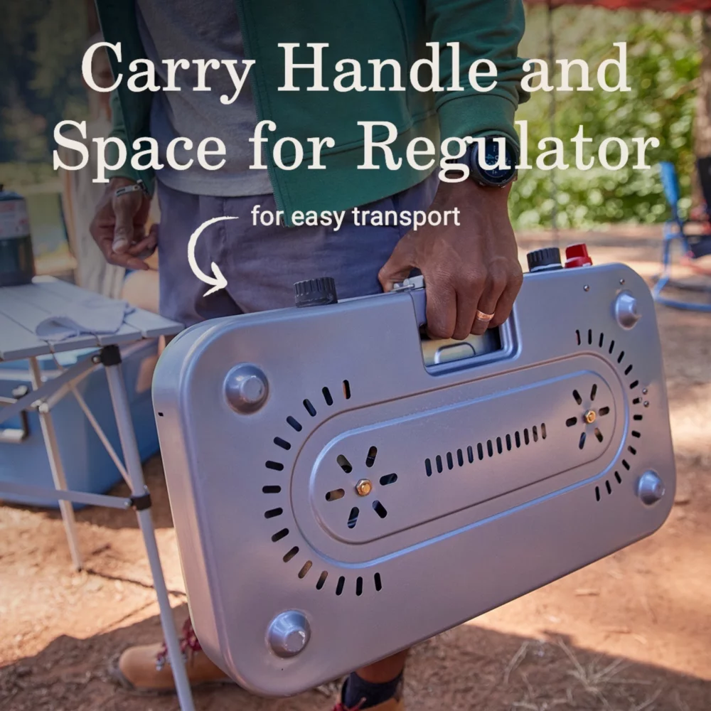 - EASY TO TRANSPORT: Recessed carry handle, secure space to store regulator, and nylon carry case for accessories; heavy-duty latch keeps the stove closed while traveling