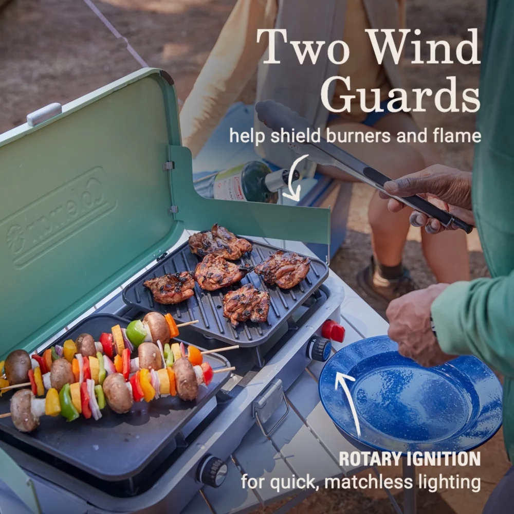 - IMPROVED COOKING CONTROL: Improved knob rotation for precise temperature and simmer control of 2 adjustable burners; rotary ignition for quick, matchless lighting