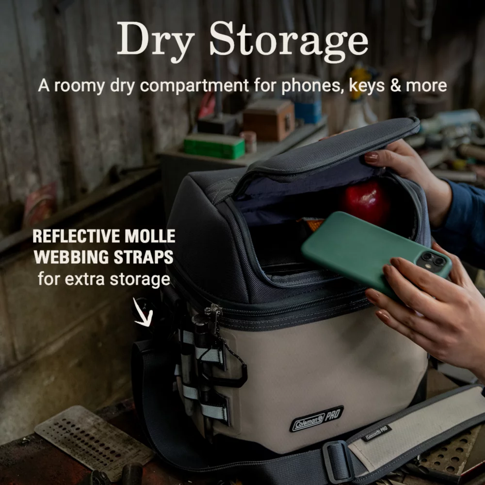 Coleman Pro is gear that works hard like you. It is purpose-built for everyday use in the most demanding environments. The Coleman Pro 16-Can Soft Cooler will keep your lunch and drinks cold while you put in the work, and a separate dry storage compartment keeps keys, phones, and more close at hand. Built tough, the durable exterior is puncture resistant and backed by a 3-year limited warranty. The antimicrobial treatment to the interior helps protect it from odor causing bacteria while a compression molded base protects the soft cooler to help prevent leaks. Throw the Coleman soft cooler over your shoulder to keep your hands free to carry toolboxes. Work smarter, not harder with oversized zipper pulls for easy access in work gloves and reflective molle webbing for extra storage.